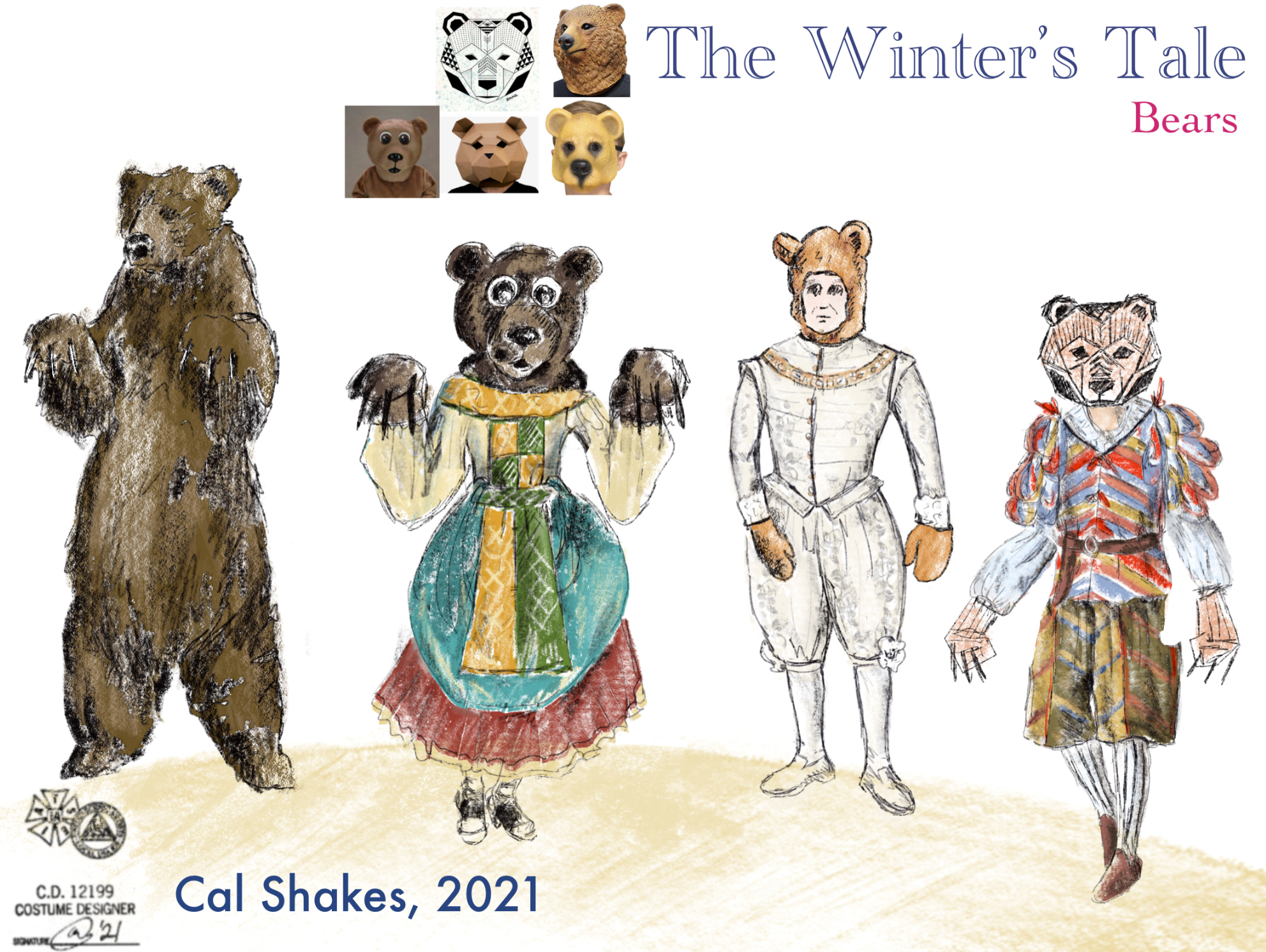 “Exit, pursued by a bear” is a famous stage direction in Shakespeare’s The Winter’s Tale taking place at the Bruns Amphitheater Sept. 1-26. Normally, a bear is never seen onstage but co-adaptors Director Eric Ting and Dramaturg Philippa Kelly had a different idea for Cal Shakes staging of this seldom seen work by the Bard. According to Kelly, the “infamous Bear comes to life in this production.” As to why the Bear is wearing a dress in Costume Designer Ulises Alcala’s sketch, you’ll have to see the show to find out!